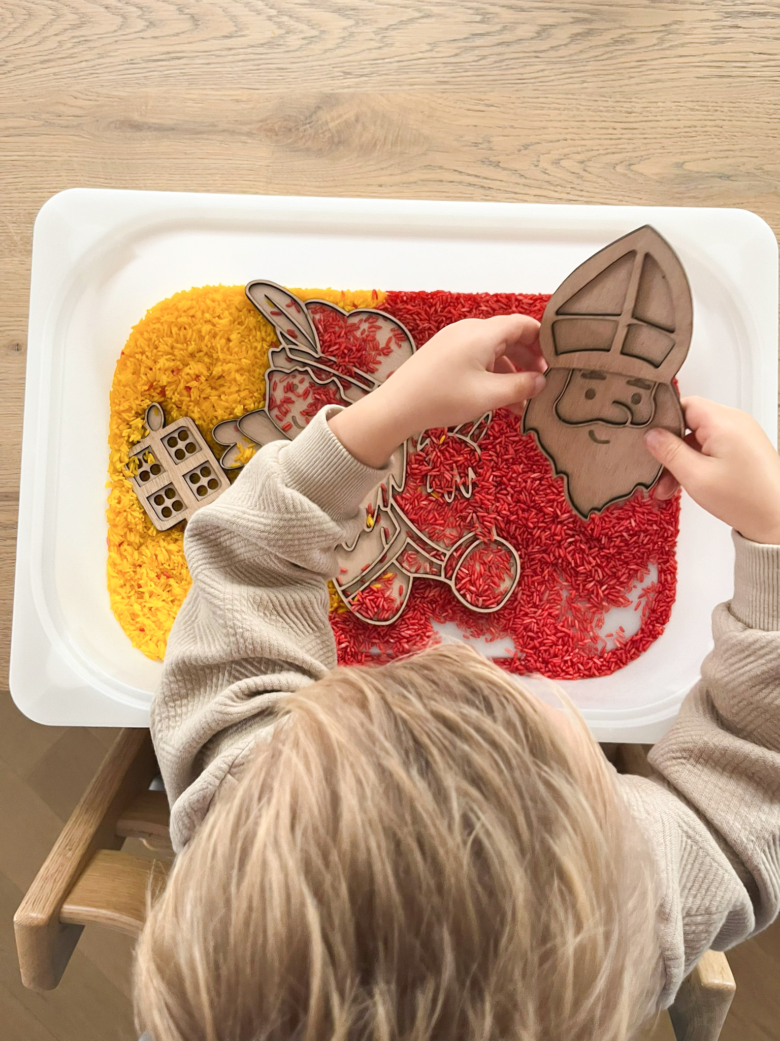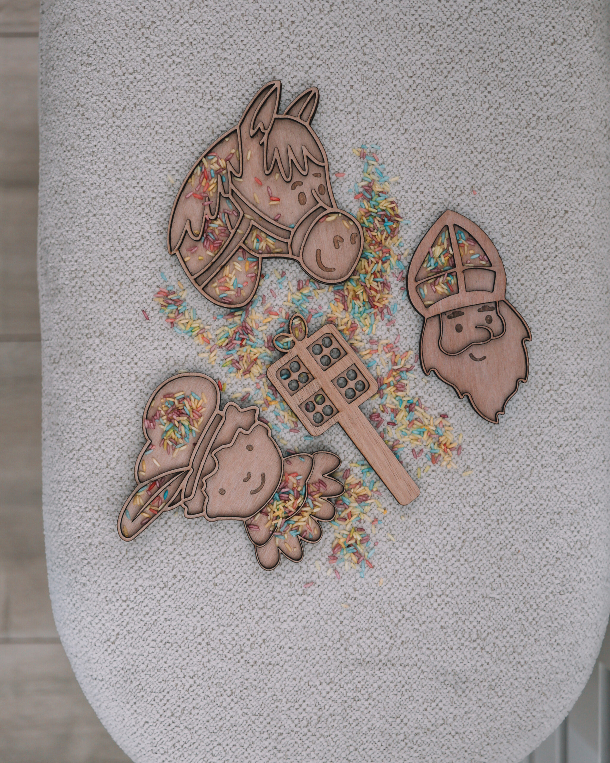 - Deze set bestaat uit een sinterklaas, een piet, een paard en een cadeau-zeefje